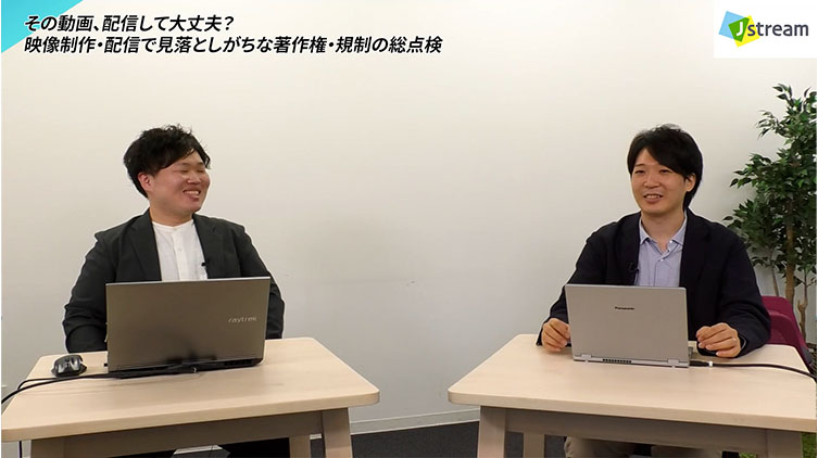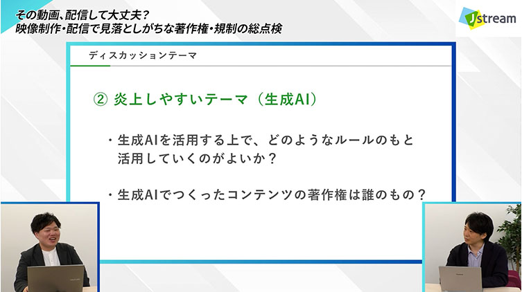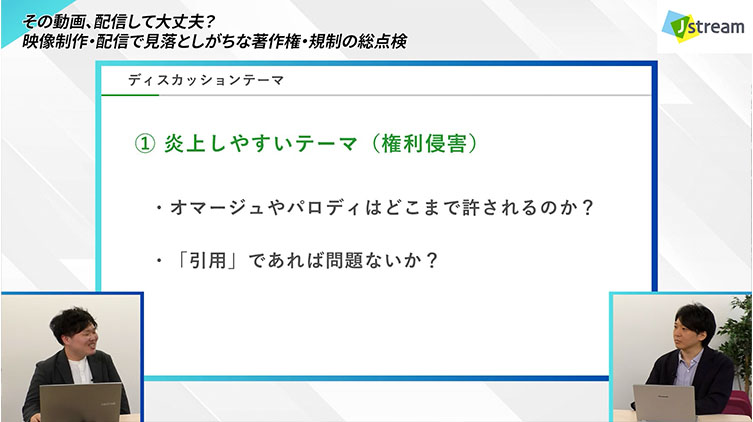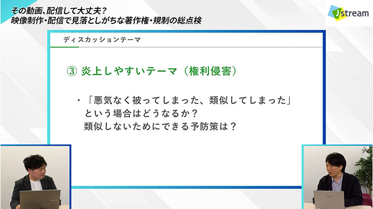 田島弁護士と、当社映像制作チーム篠原とのディスカッションパートです。講演の内容を深掘りする形で、いろいろなテーマを挙げながらディスカッションを行っていきます。