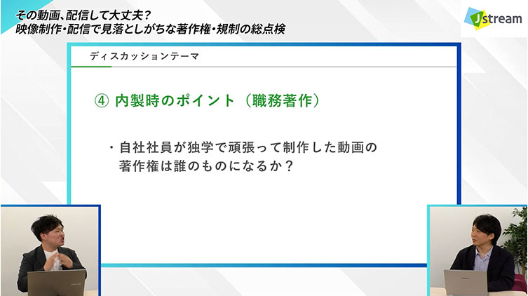 篠原: 次は、映像制作を内製している企業において、自社社員が独学で頑張って制作した動画の著作権は、誰のものになるのかです。