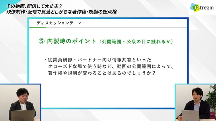 篠原: 次に、従業員研修やパートナーさん向けの情報共有など、ある程度限られた公開範囲においては、著作権の考え方は変わってくるのかというテーマです。例えば、社長の好きなアーティストの曲をこっそり使いたいというようなシーンもあるかと思います