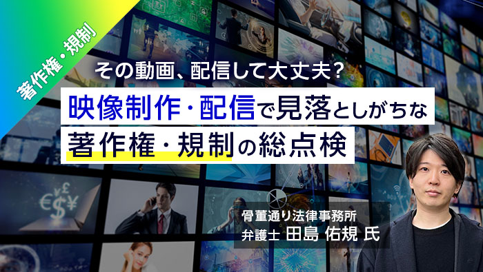 そこで、メディア・エンターテイメント業界のクライアントに対する法務サポートを中心に扱う「骨董通り法律事務所」の田島弁護士をお迎えし、動画制作・配信に携わるうえで、「知っておくべき著作権・規制に関するポイント」を解説いただきました。