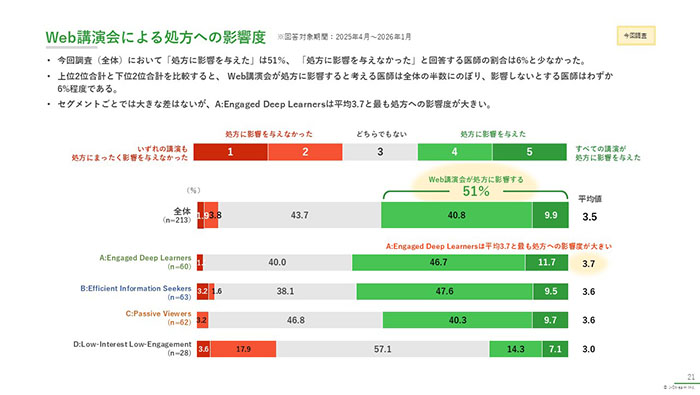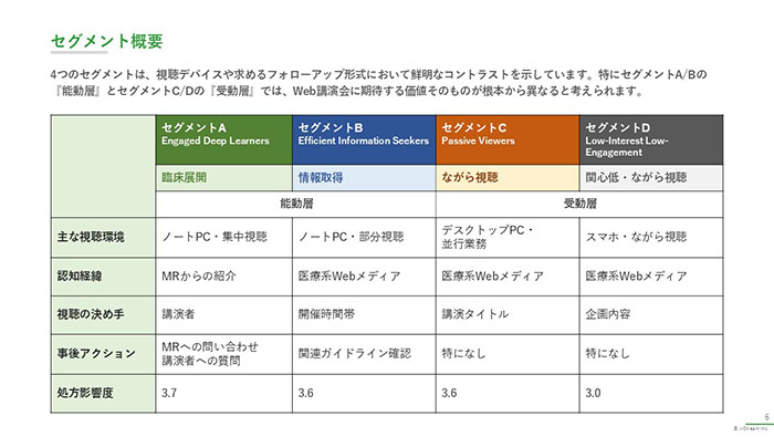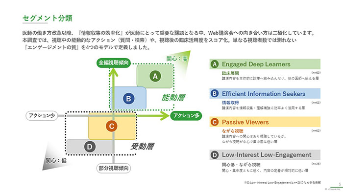 視聴行動や情報収集スタイルに基づき医師を4つの視聴行動モデルに分類。各層の「認知経路」や「視聴後のフォローアップニーズ」を分析し、情報提供のあり方を考えるための視点をまとめました。